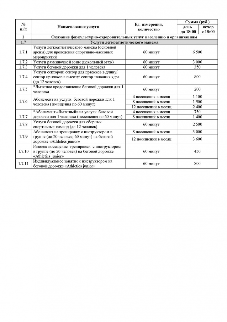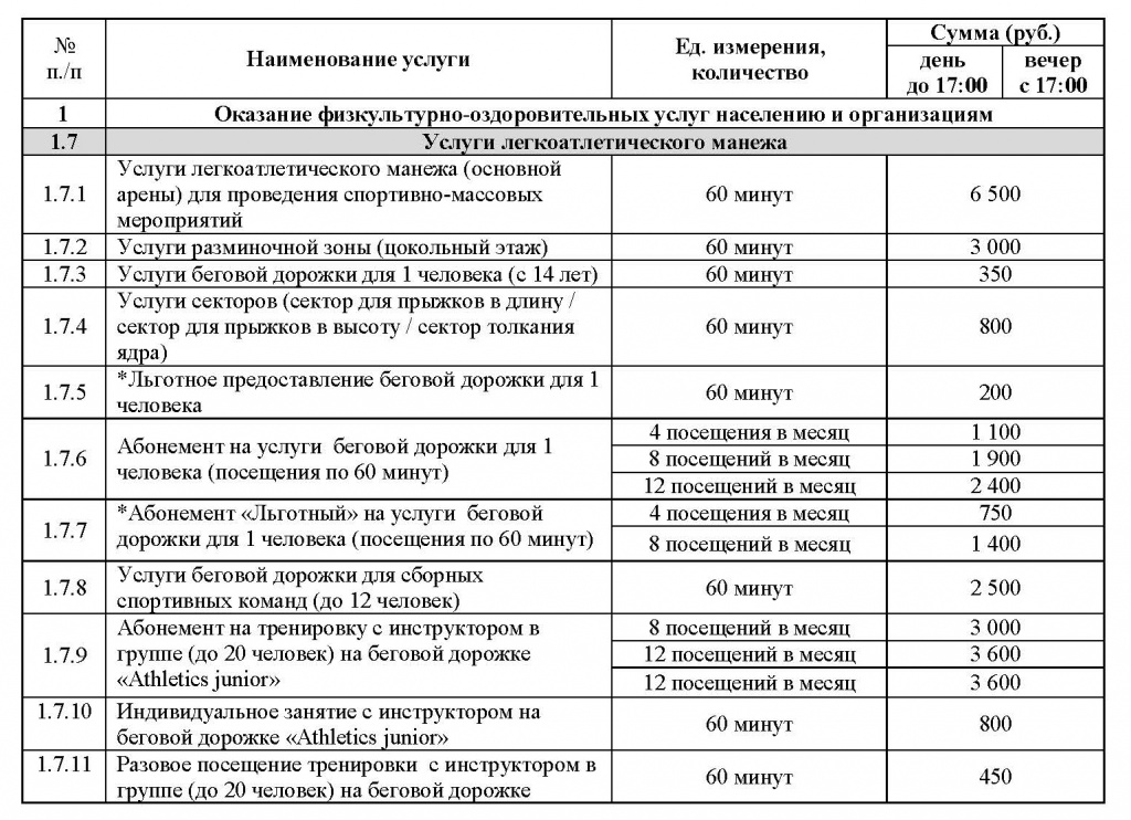 Тарифы на услуги легкоатлетического манежа