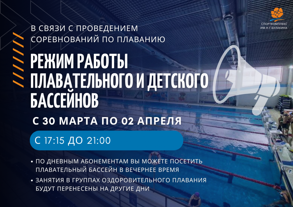 В связи с проведением соревнований по плаванию с 30 марта по 02 апреля в плавательном и детском бассейне временно изменен режим работы⏰